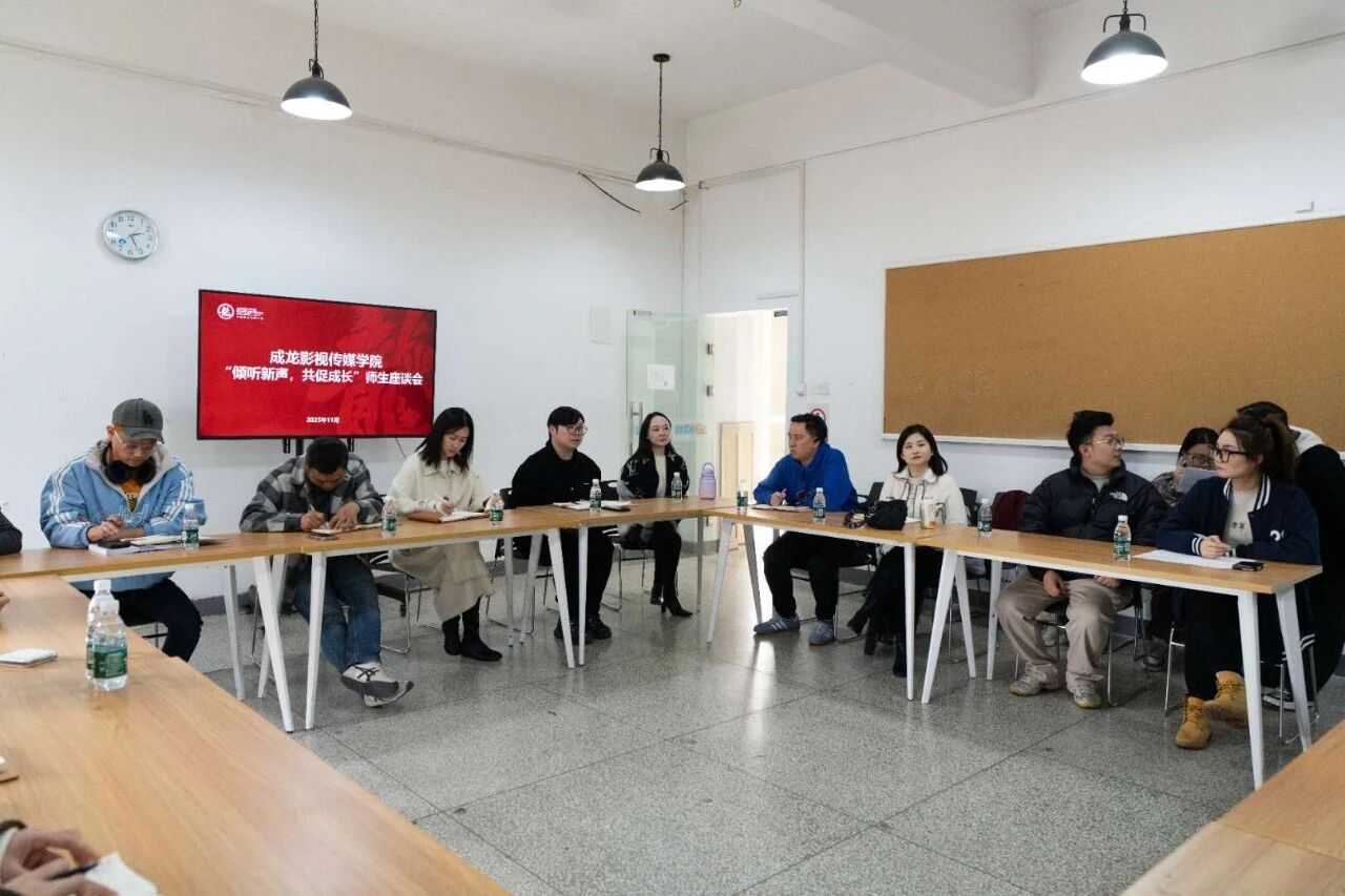 2025年11月27日,成龙影视传媒学院举行“倾听新声,共促成长”师生座谈会。学院党总支副书记吴晶、院长助理吴凡、各专业负责人、全体辅导员老师与各年级学生代表齐聚一堂,围绕同学们在学业发展方面产生的困惑进行解答。在轻松、开放的氛围中,学生代表们踊跃发言,结合各自专业的特性和亲身经历,提出了许多具有建设性的意见和建议。问题涵盖了课程设置、实践教学、设备资源、就业指导等多个方面。例如,播音与主持艺术专业的同学就校外实践机会与课程集中度提出了疑问;表演专业的同学对排练场地和发展方向提出来疑问等等。同学们的发言准备充分,思考深入,充分体现了成影学子心系学院、积极向上的精神风貌。