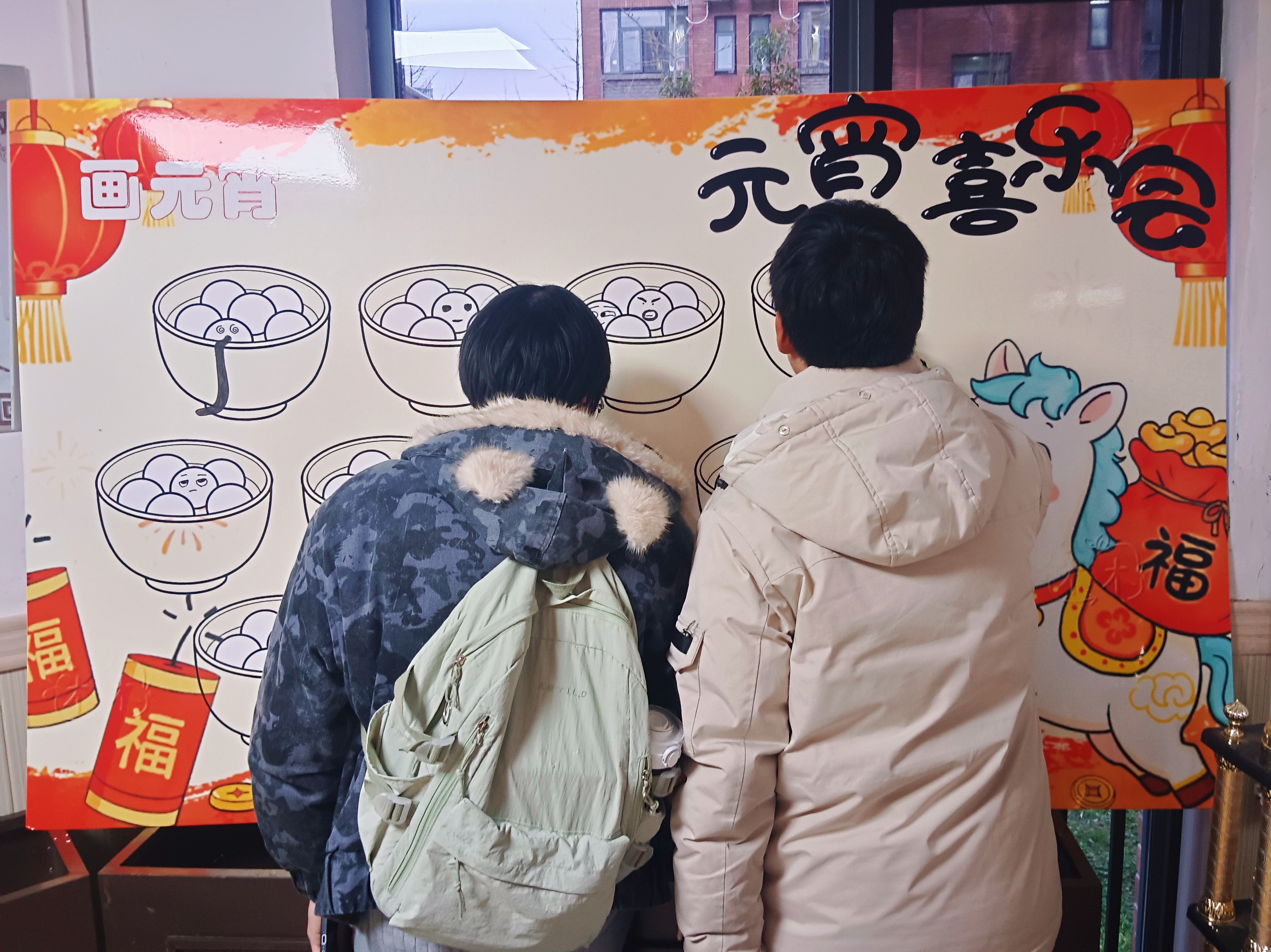“画元宵”区域里,元宵主题背景墙前围满了创意满满的同学。彩笔在空白“元宵”上飞舞,可爱的笑脸、灵动的图案、别致的创意线条,每一笔都是同学们对元宵佳节的美好期许,简单的手绘互动,让大家在创作中感受节日的浪漫与趣味。