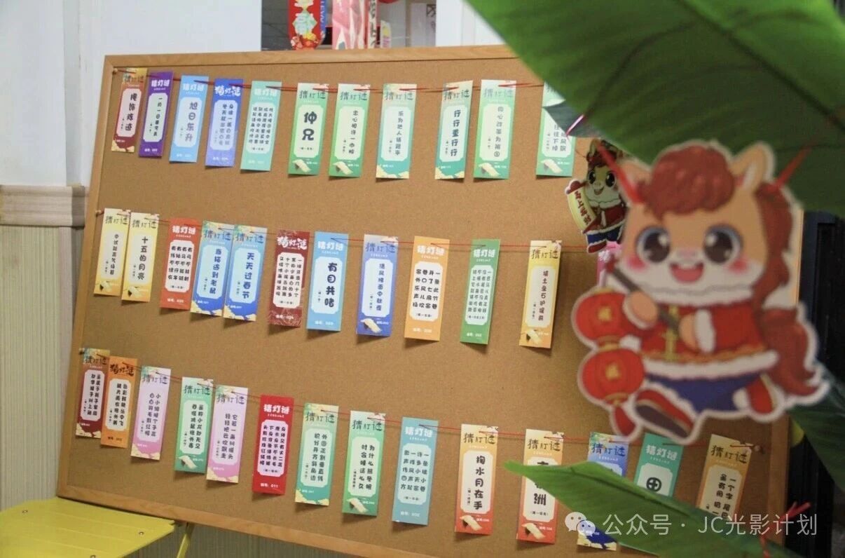 夜幕尚未降临,月影书院社区就已经热闹起来。红灯笼次第亮起,暖光在中庭与走廊间轻轻摇曳;仿古洒金的灯谜条系着红绳流苏,错落悬挂;马年生肖贴纸点缀其间,一幅“灯映月影、书香伴元宵”的雅致图景已然铺展。