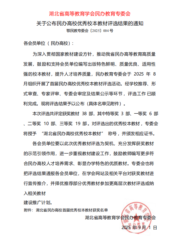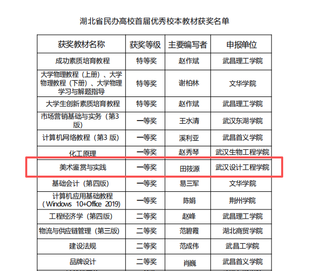 近日,湖北省高等教育学会民办教育专委会发布了《关于公布民办高校优秀校本教材评选结果的通知》(鄂民教专委会〔2025〕004号),我院教师田筱源主编的《美术鉴赏与实践》教材,在全省首届民办高校优秀校本教材评选中斩获一等奖,为学校教材建设再添重要成果。